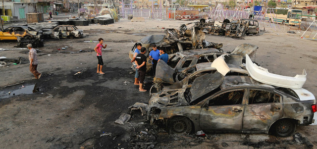 مدنيون في موقع تفجير استهدف حي مدينة الصدر ببغداد وأسفر عن قتلى. أ.ب