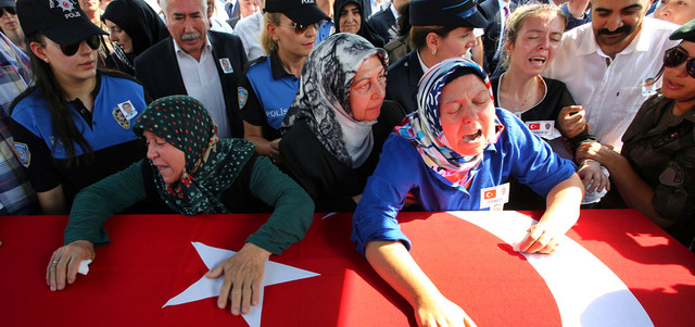 أقرباء ضابط قتله «الكردستاني» يبكون خلال تشييعه في أنقرة. أ.ب