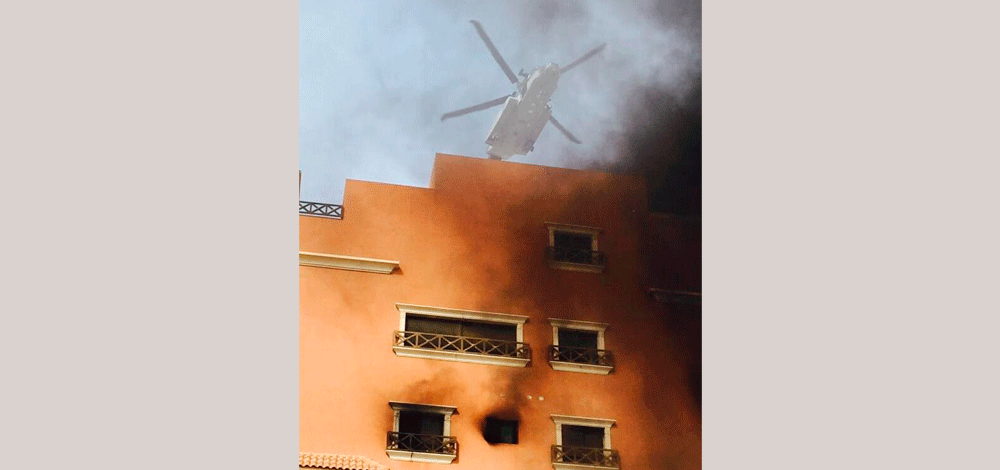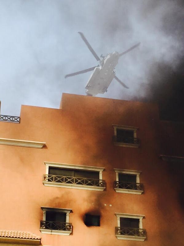 وقال الدفاع المدني السعودي في بيان صباح اليوم إن "الحادث عبارة عن حريق اندلع في أحد الأقبية المتصلة بكافة الأبراج" ، لافتة إلى أن طيران الأمن وشركة أرامكو وفرق السلالم يشاركون في عملية الإخلاء لساكني البرج.