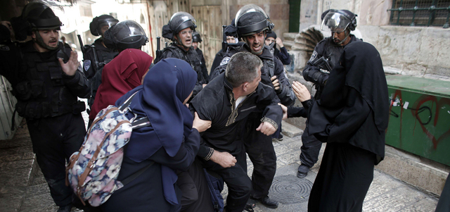 قوات الاحتلال تعتدي على المصلين في القدس عقب منعهم من الوصول إلى المسجد الأقصى أمس. أ.ف.ب