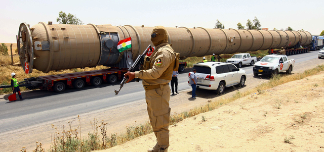 مقاتلون من البشمركة يحرسون معدات لمصفاة كلك قرب أربيل. أ.ب