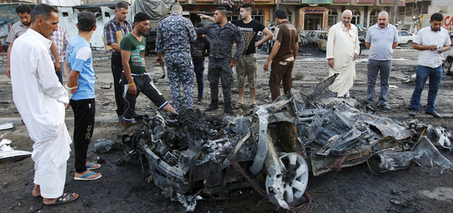 مدنيون ورجال أمن يعاينون موقع انفجار سيارة مفخّخة في بغداد. رويترز