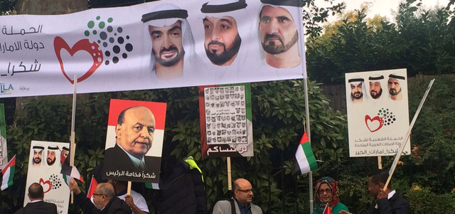 نظم المئات من أبناء الجالية اليمنية ببريطانيا تظاهرة كبرى مؤيدة للتحالف العربي في اليمن ظهر أمس، أمام السفارة الإماراتية في لندن، رافعين شعارات حملتي «شكراً مملكة الحزم» و«شكراً إمارات الخير»، وصور قادة السعودية والإمارات.