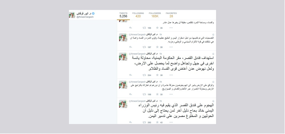 أكد وزير الدولة للشؤون الخارجية، الدكتور أنور بن محمد قرقاش، في تغريدة عبر صفحته على موقع التواصل الإجتماعي "تويتر"، أن الهجوم على فندق القصر الذي يقيم فيه رئيس الوزراء اليمني خالد بحاح دليل آخر لمن يحتاج إلى دليل أن الحوثيين و المخلوع مصرين على تدمير اليمن.