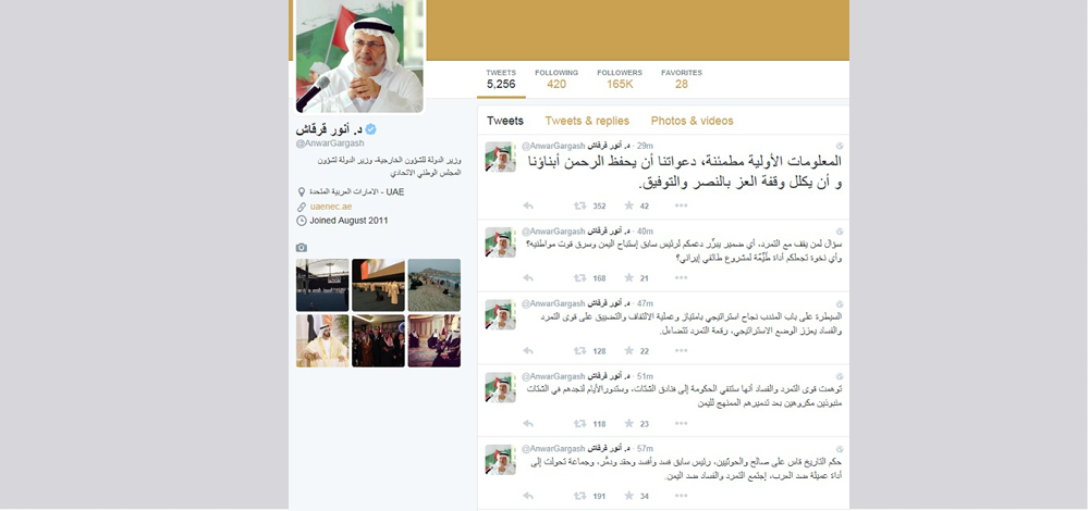 وتساءل قرقاش قائلاً.. "اشاعات قنوات ايران واعلامها من الميادين والمنار والسفير متوقع، ولكن اين موقع روسيا اليوم من أزمة اليمن؟ وهل سيطر عليها اعوان ايران تحريريا؟".