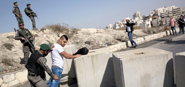 شرطي إسرائيلي خلال تفتيش فلسطيني في القدس. أ.ب