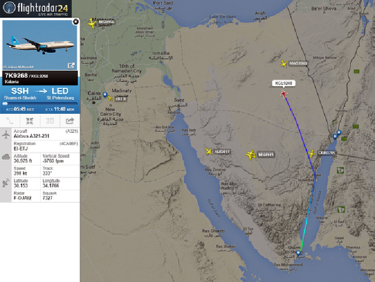 وكانت الطائرة قد أقعلت من مطار شرم الشيخ قبل إعلان فقدان الاتصال بها. الطائرة كانت تقل سياحاً روساً إلى مدينة سان بطرسبرغ، وتشغلها شركة طيران "كوجاليمافيا" الروسية.