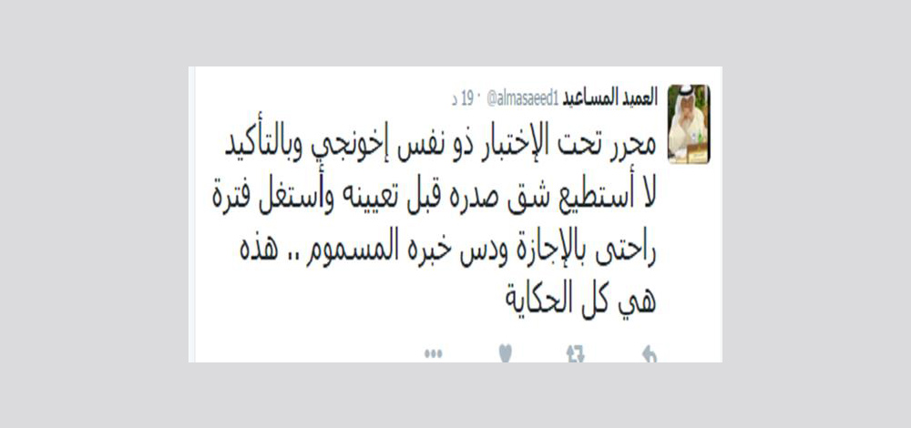 وقال المساعيد "إن محرراً ذو نفس إخواني يسعى للفرقة بين الشعوب وقطع الأرحام، عمد إلى نشر أخبار مغلوطة ومسيئة بحق دولة الإمارات العربية المتحدة، استغل فرصة الإجازة الأسبوعية وغياب غالبية المسؤولين عن الطاقمين الإداري والتحريري للجريدة".