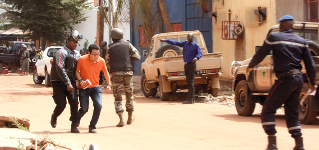 وقال مصدر أمني رفيع وموظف بالفندق إن مسلحين «يكبرون» هاجموا الفندق الذي كان يقيم فيه كثير من الأجانب، في وقت مبكر من صباح أمس الجمعة، وأخذوا 170 شخصاً رهائن. وتحدث مصدر دبلوماسي عن اثنين أو ثلاثة مهاجمين.