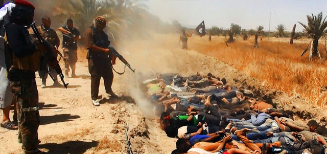 صورة منسوبة لـ«داعش» على «تويتر» لعشرات الرجال على الأرض بينما يطلق عليهم مجموعة من المسلحين النار. أ.ف.ب