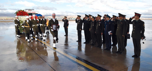 جنود أتراك يحملون جثمان الطيار الروسي إلى طائرة روسية خلال حفل أقيم في مطار إيسينبوجا في أنقرة. أ.ف.ب