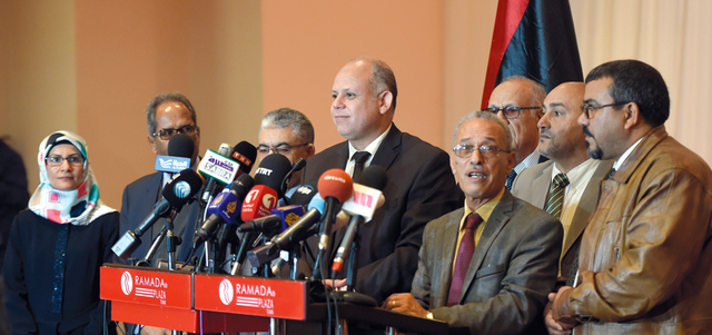 ممثلون عن البرلمان المعترف به دولياً وبرلمان ميليشيات طرابلس خلال مؤتمر صحافي. أ.ف.ب