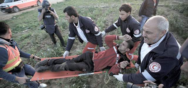 فلسطينيون يسعفون شاباً أصيب بمواجهات مع الاحتلال شرق غزة. أي.بي.إيه