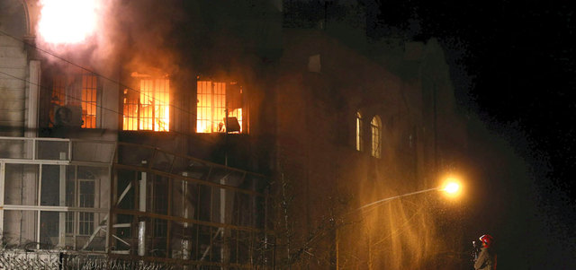 ألسنة اللهب ترتفع من السفارة السعودية بعد اعتداء متظاهرين إيرانيين عليها الأحد الماضي. رويترز