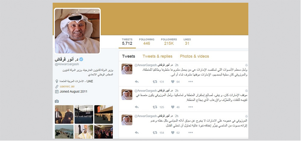 واختتم وزير الدولة للشؤون الخارجية، الدكتور أنور بن محمد قرقاش قائلاً، "لعل معظم الأصوات التي تستقصد الإمارات هي من يحمل مشروعا متطرفا وطائفيا للمنطقة، والمرزوقي كان مطية لبعضهم، الإمارات موقفها مشرف شاء أم أبى".