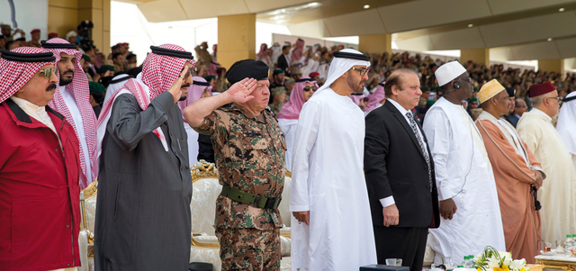 وكان صاحب السمو الشيخ محمد بن زايد آل نهيان، حضر العرض العسكري يرافقه سمو الشيخ طحنون بن زايد آل نهيان، مستشار الأمن الوطني، وسمو الشيخ خالد بن محمد بن زايد آل نهيان، رئيس جهاز أمن الدولة، ونائب الأمين العام لمجلس الأمن الوطني علي بن حماد الشامسي، ورئيس جهاز الشؤون التنفيذية خلدون خليفة المبارك، ووكيل ديوان ولي عهد أبوظبي محمد مبارك المزروعي، ونائب رئيس أركان القوات المسلحة الفريق الركن مهندس عيسى سيف بن عبلان المزروعي، وسفير الدولة لدى السعودية محمد سعيد محمد الظاهري. وبدأ العرض العسكري بالسلام الملكي، بعدها قام خادم الحرمين الشريفين بالتفتيش على طابور الوحدات المشاركة والآليات والتجهيزات العسكرية المشاركة في العرض العسكري تلاه آيات من الذكر الحكيم.
