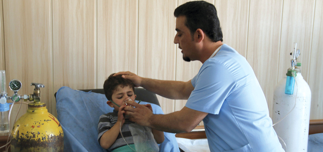 طفل يتلقى العلاج في مستشفى ببلدة تازة بعد تعرضها لهجوم كيماوي. أ.ب
