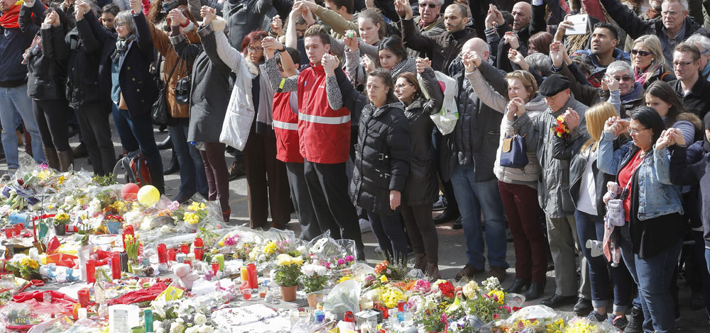 تجمع مناهض للإرهاب إحياءاً لذكرى ضحايا التفجيرات الإرهابية في بروكسل. إي بي أيه