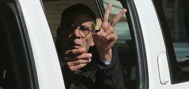 مصطفى يرفع شارة النصر لدى مغادرته المحكمة. أ.ب