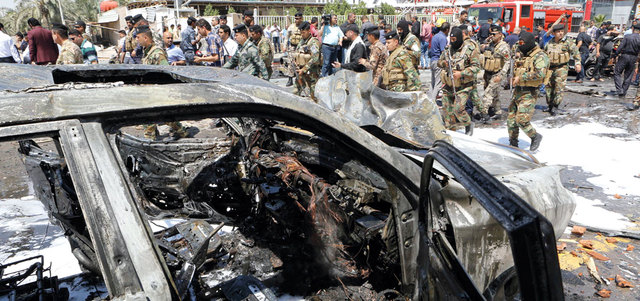 قوات أمن تتفقد الأضرار الناجمة عن هجوم انتحاري في البصرة. أ.ب