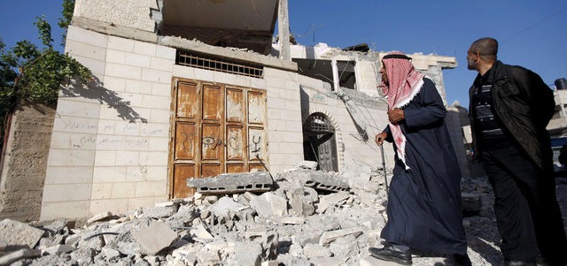 فلسطينيون أمام منزل الشهيد زكارنة الذي هدمه الاحتلال في قباطية. أ.ب