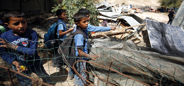 صبية فلسطينيون بالقرب من منشآت فلسطينية هدمها الاحتلال في أريحا. رويترز