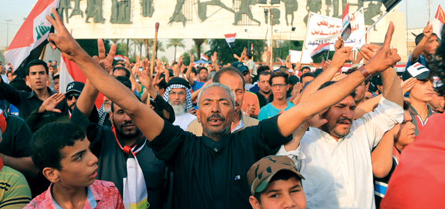 تظاهرة لأتباع الصدر تطالب بالإصلاح في ساحة التحرير ببغداد. أ.ب