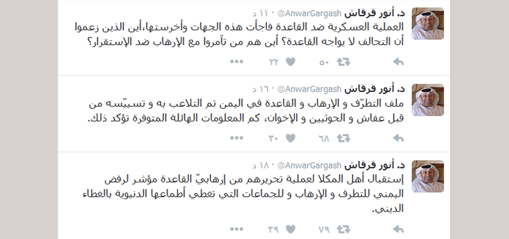 وتابع قرقاش في تغريدة أخرى: "ملف التطرّف و الإرهاب و القاعدة في اليمن تم التلاعب به و تسييّسه من قبل عفاش و الحوثيين و الإخوان، كم المعلومات الهائلة المتوفرة تؤكد ذلك".