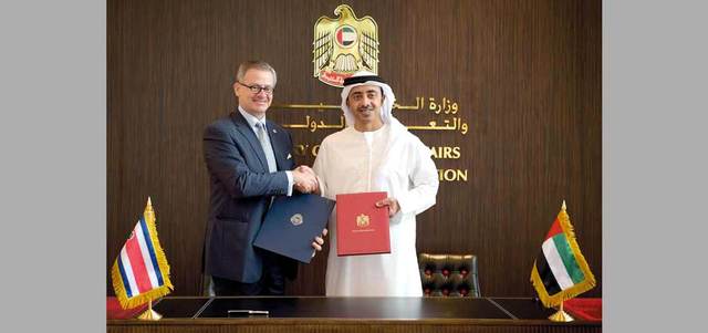وقال سموه، إنه «مع توقيع اتفاقية النقل الجوي بين البلدين خلال زيارتي إلى كوستاريكا في شهر فبراير الماضي، فإننا نتطلع إلى تزايد نمو التبادل الاقتصادي والتجاري بين البلدين». جاء ذلك في بيان مشترك، صدر بعد اجتماع عقده سموه مع وزير خارجية كوستاريكا مانويل غونزاليس سانز، في ديوان عام الوزارة بأبوظبي.