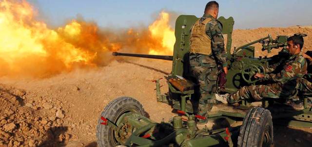عناصر من البشمركة يطلقون النار على «داعش» عند خط الجبهة بالقرب من قرية حسن شام. أ.ف.ب