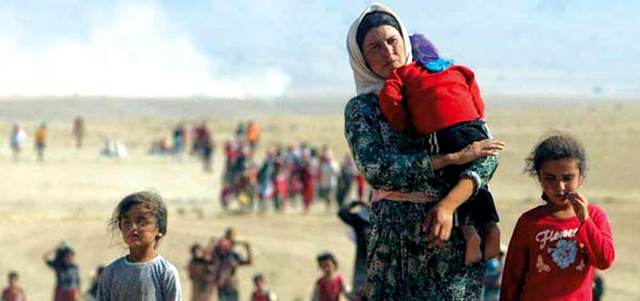 عائلات يزيدية تفرّ من «داعش» بمنطقة سنجار في العراق. رويترز