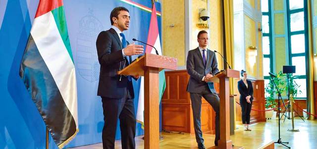 عبدالله بن زايد مع وزير الشؤون الخارجية والتجارة المجري. وام