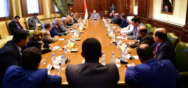 هادي مع مستشاريه ورئيس وأعضاء الوفد الحكومي في مشاورات الكويت. سبأنت