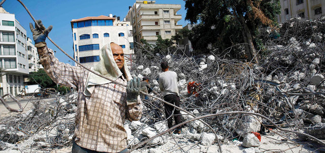 عمال يزيلون أنقاض مبانٍ دمرت بالعدوان على غزة صيف 2014. أ.ف.ب