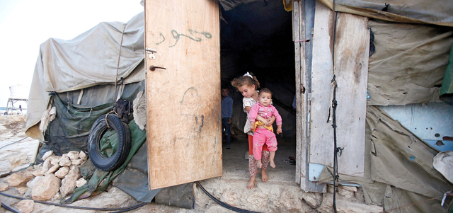 طفلة فلسطينية تحمل شقيقتها في خيمة جنوب الخليل. إي.بي.إيه