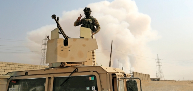 جندي عراقي يرفع شارة النصر خلال عمليات عسكرية ضد «داعش» في منطقة القيارة. رويترز