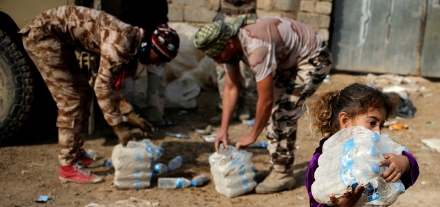 فتاة تحمل زجاجات مياه قدمها جنود عراقيون خارج الموصل. رويترز