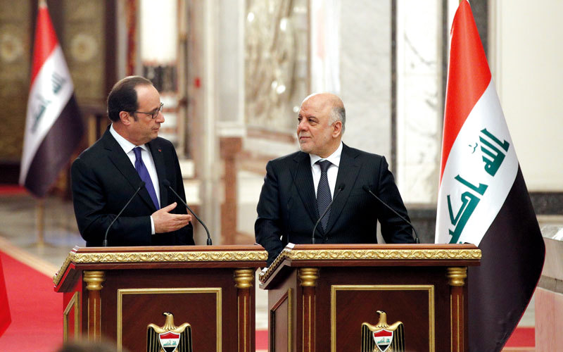 وقال «كل ما يسهم في إعادة إعمار العراق يعد خطوة إضافية لتجنب ضربات (داعش) على أراضينا». كما بحث هولاند مع رئيس الوزراء العراقي حيدر العبادي، سبل محاربة الإرهاب.