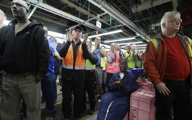 عمال مصنع لفورد في ميشيغان يصفقون بعد إعلان الرئيس التنفيذي للشركة إلغاء مشروع المصنع في المكسيك. أ ب