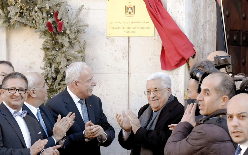 من ناحية أخرى، افتتح الرئيس الفلسطيني محمود عباس، أمس، سفارة دولة فلسطين لدى الفاتيكان. وقال في كلمة مقتضبة أمام الصحافيين، خلال حفل افتتاح السفارة، «التقينا قداسة البابا فرانسيس، وتحدثنا مطولاً حول عملية السلام، وأكدنا أهمية محاربة الإرهاب والتطرف في جميع أنحاء العالم».