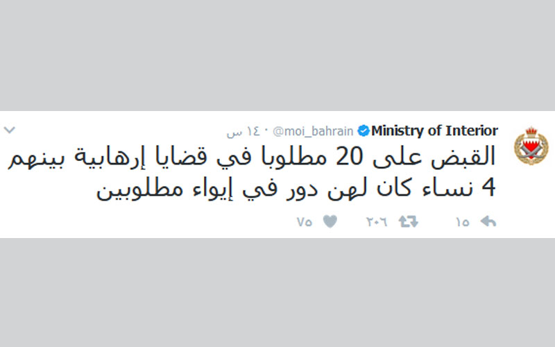 أعلنت وزارة الداخلية البحرينية اليوم أنها قبضت على 20 مطلوبا في قضايا إرهابية من بينهم 4 نساء كان لهن دور في إيواء مطلوبين وهاربين والتستر عليهم.