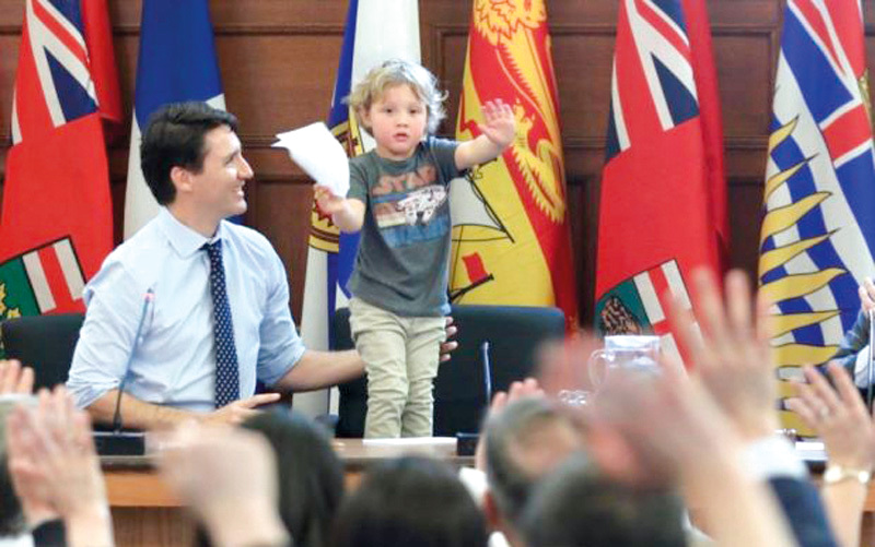 اصطحب رئيس وزراء كندا، جستن ترودو، ابنه البالغ من العمر ثلاث سنوات، هادريان ترودو، لمكتبه الأربعاء الماضي، وعلى الرغم من جدول الأعمال اليومي المزدحم لرئيس الوزراء، مثله مثل بقية زعماء العالم، فإنه وجد متسعاً من الوقت لقضاء وقت ممتع مع ابنه في المكتب الرئاسي يسابقه ويلعب معه. وتعكس صور فوتوغرافية أطلقها ترودو على صفحته في «فيس بوك» كيف أن الاثنين استقبلا الصحافة والسياسيين، ونشر صوراً أخرى للصغير وهو جالس على مكتب والده مستقبلاً السياسيين ورجال الصحافة. ويبدو أن ترودو يريد أن يعكس لقادة العالم الطريقة التي يمكنهم من خلالها استقطاب الشعبية. وتمخض عن هذه الصور أكثر من 5000 تعليق، حيث خاطب أحد مستخدمي «فيس بوك ترودو» قائلاً «لقد كنت كبيراً بما فيه الكفاية لأتذكر صورك بمعية والدك - رئيس الوزراء السابق، بيير ترودو - عندما كان يصحبك لمكتبه»، وعلق آخر: «سواء كانت هذه الصور لأغراض العلاقات العامة أم لا، فإنه لا يمكننا وصف ترودو سوى أنه رجل أسرة من الطراز الأول».