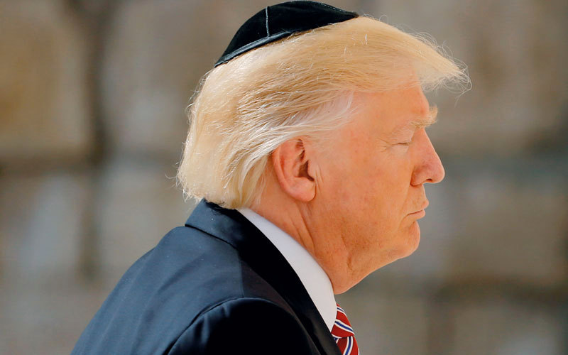 | ترامب أول رئيس أميركي يزور حائط البراق في البلدة القديمة بالقدس، خلال وجوده في السلطة. |