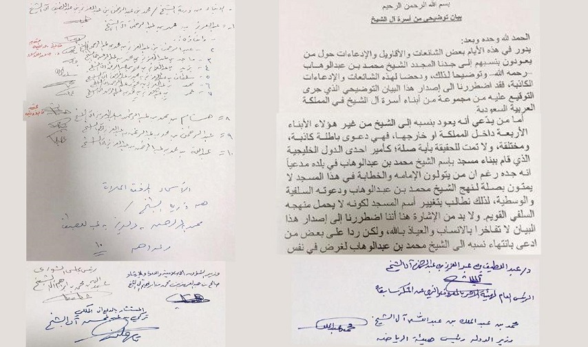 أصدرت أسرة آل الشيخ بيانا وقع عليه عدد كبير من أبنائها، مفندين ادعاء أمير قطر بأن نسبه يعود إلى الشيخ محمد بن عبد الوهاب ومنهجه "ودعوته السلفية والوسطية"، مطالبين بتغيير اسم مسجد أقيم في قطر باسم الشيخ بن عبد الوهاب، وذلك كما ذكرت قناة "سكاي نيوز" عبر موقعها الإلكتروني.
