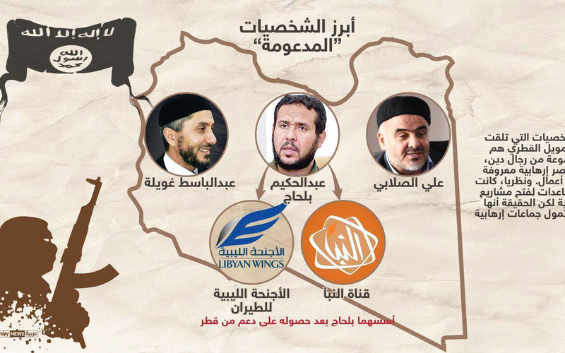 وصعدت أربعة أسماء في واجهة المشهد المضطرب في ليبيا بشكل مفاجئ، كانت مهمتهم تنفيذ المخطط القطري، وهم الزعيم السابق للجماعة الليبية المقاتلة عبدالحكيم بلحاج، والأخوان علي وإسماعيل الصلابي، والقيادي المتطرف المهدي الحاراتي المدرج مع البقية على قائمة الإرهاب المدعوم من قطر.