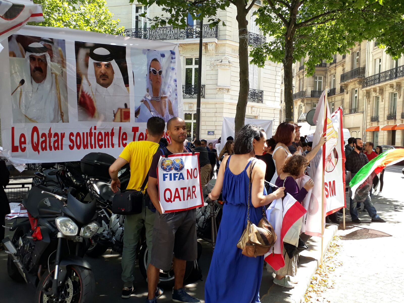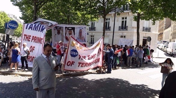 نظم نشطاء وحقوقيون مظاهرة أمام السفارة القطرية في العاصمة الفرنسية باريس، الاثنين، للاحتجاج على دعم الدوحة للجماعات الإرهابية.