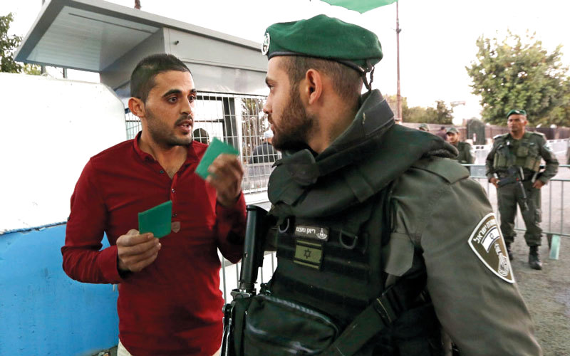 جندي إسرائيلي يجادل فلسطينياً في إحدى نقاط التفتيش. إي.بي.إيه