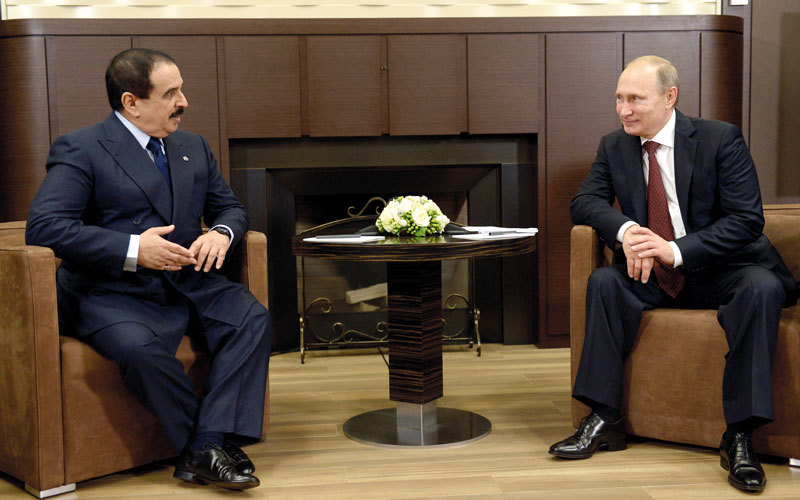 ملك البحرين في لقاء سابق مع الرئيس الروسي. أرشيفية: أ.ب