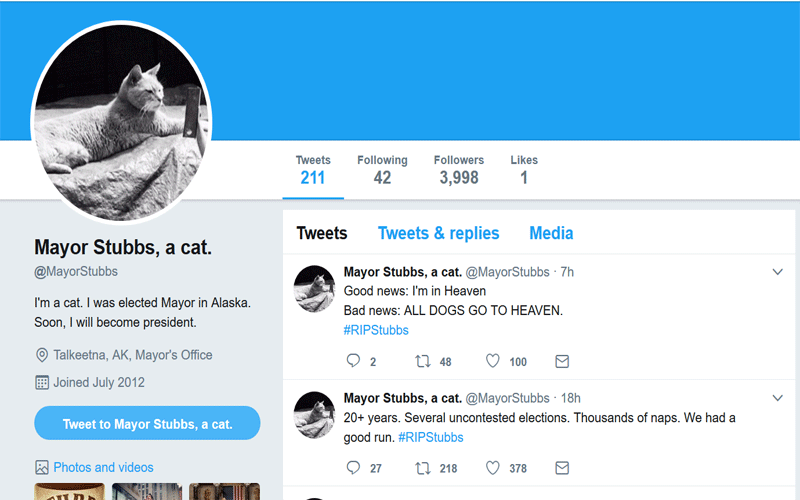 أعلن حساب القط ستابس، عمدة مدينة تالكيتنا، في ولاية ألاسكا الأميركية، وفاته اليوم، وذلك نتيجة الشيخوخة. ونعت ستابس، "العمدة القط"، الأسرة الأميركية التي تتبناه بحزن عميق قائلة "لقد رحل العمدة المحبوب"، الذي "عاش مناضلاً حتى آخر يوم في عمره"، فيما جاءت آخر تغريدة على حساب ستابس على "تويتر" اليوم لتعلن وفاة "العمدة القط" حيث جاء فيها " الخبر السعيد: أنا في السماء.. والخبر السيء كل الكلاب تذهب إلى السماء".