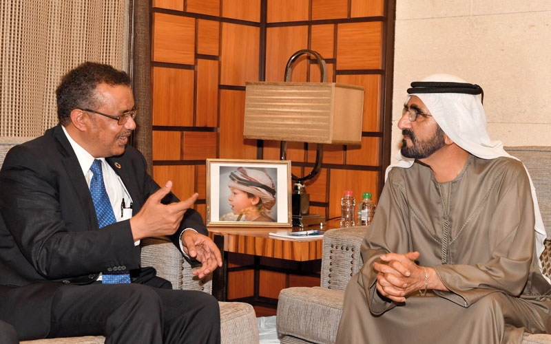 استقبل صاحب السمو الشيخ محمد بن راشد آل مكتوم، نائب رئيس الدولة رئيس مجلس الوزراء حاكم دبي، أمس، في استراحة سموه بمنطقة المرموم بدبي، بحضور سمو الشيخ مكتوم بن محمد بن راشد آل مكتوم، نائب حاكم دبي، وسمو الشيخ أحمد بن محمد بن راشد آل مكتوم، رئيس مؤسسة محمد بن راشد آل مكتوم للمعرفة، الدكتور تيدروس أدهانوم غيبرييسوس، المدير العام لمنظمة الصحة العالمية.